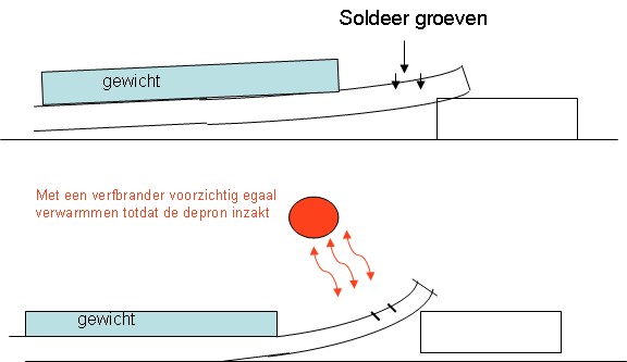 - Met een soldeerbout zijn twee groeven van ongeveer 3 mm diepte in de depron