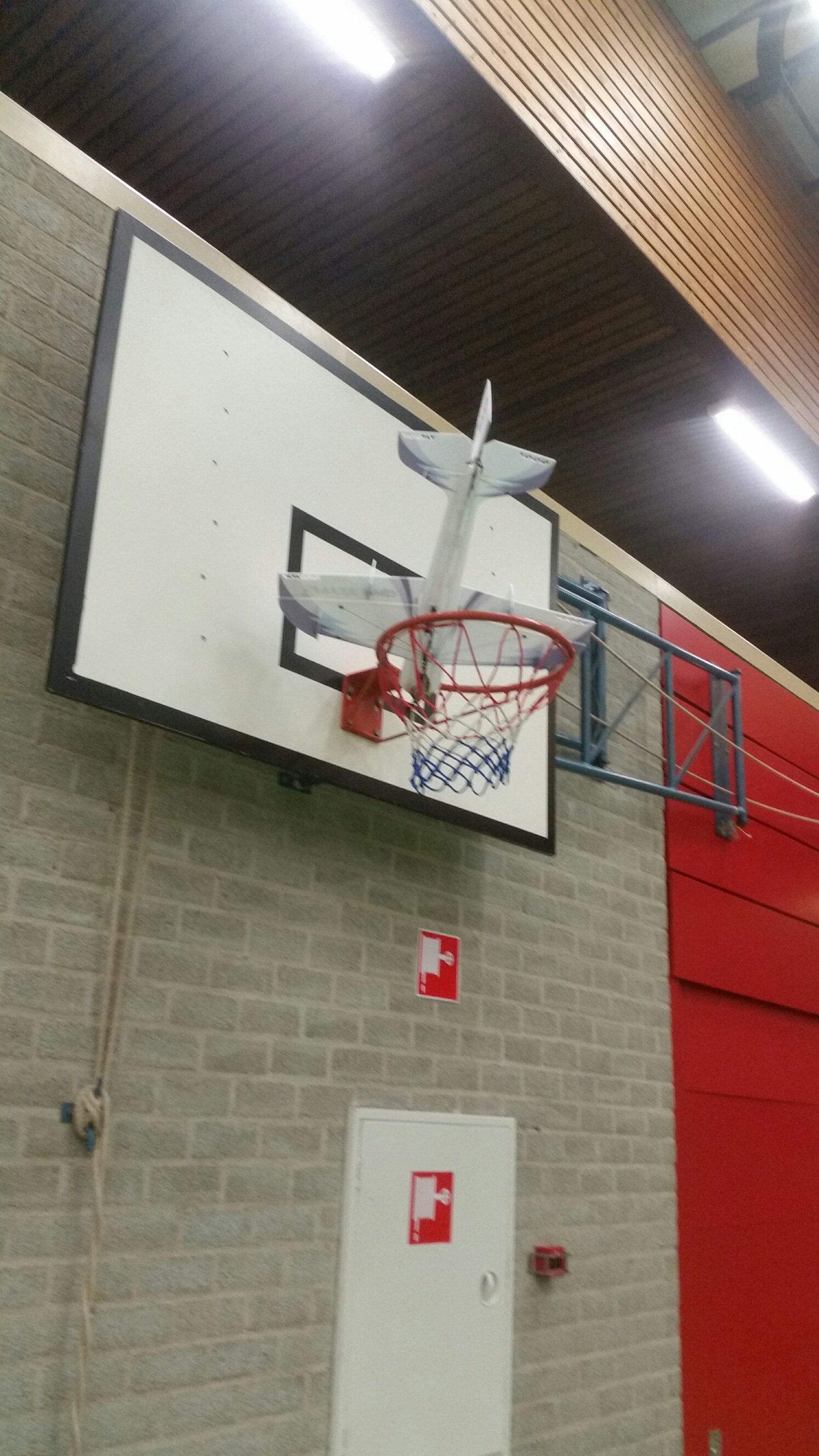 Indoorvliegen in theothorne: Bennie dacht ik ga landen in een basketbalnet. En dat is dus goed gelukt. |