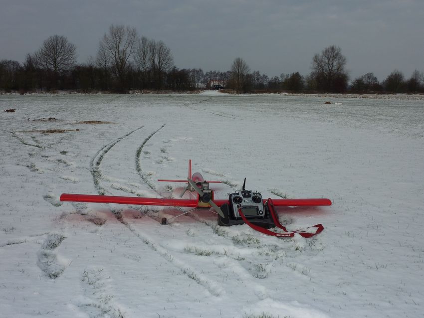laatste kans dit jaar) nog te kunnen "brevetvliegen" Maar er was verder niemand ! Wellicht ook maar beter Na een prima start sloeg de motor na 4 min af. Keurig geland (zie spoor op de foto). Vanwege de hevige kou (-9,5 Grd) wilde de motor niet (meer) lopen. |